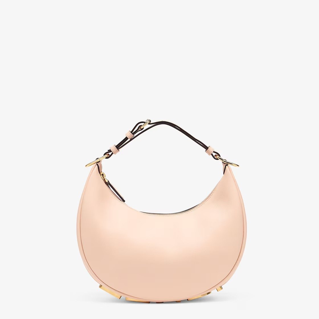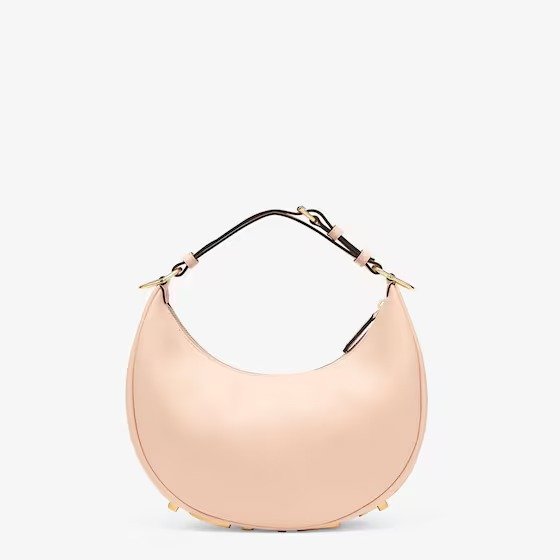 Small hobo bag made of soft pale pink leather, with vintage gold metal FENDI lettering visible when the bag is worn under the arm.
