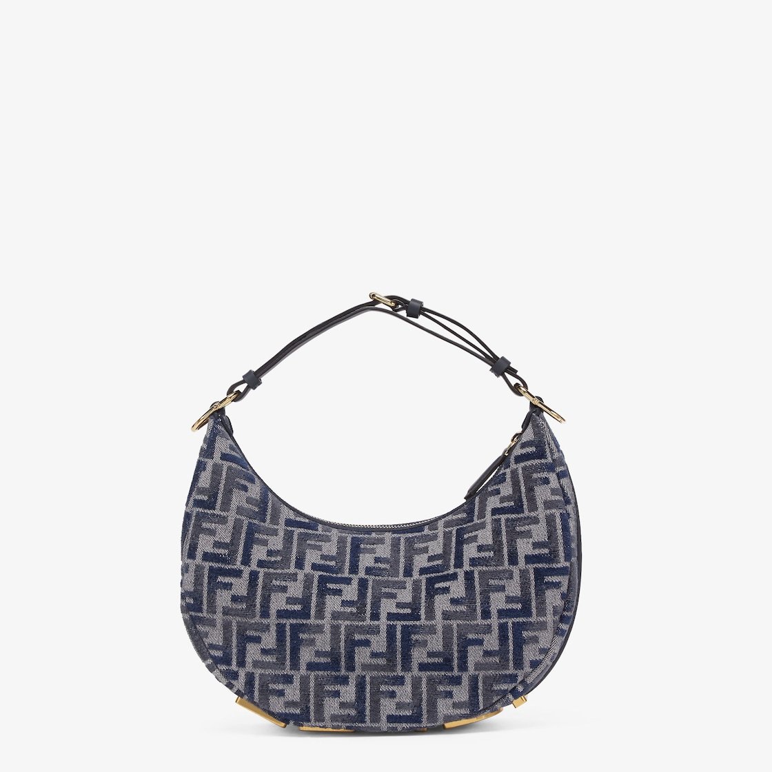 Made of chenille with the iconic FF motif in gradient dark blue tones, decorated with vintage gold-finish metal FENDI lettering on the base, visible when wearing the bag under the arm.