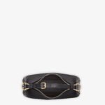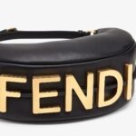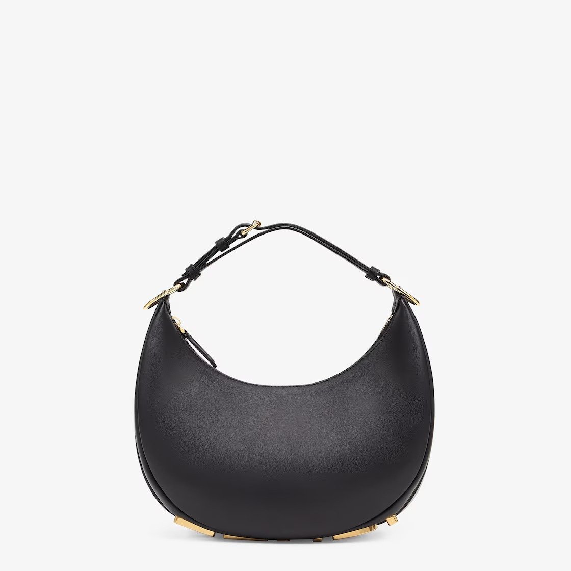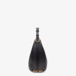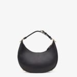 Small hobo bag made of soft black leather, with vintage gold metal FENDI lettering visible when the bag is worn under the arm.