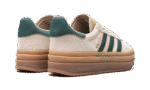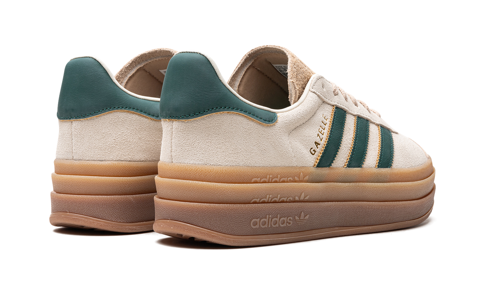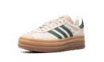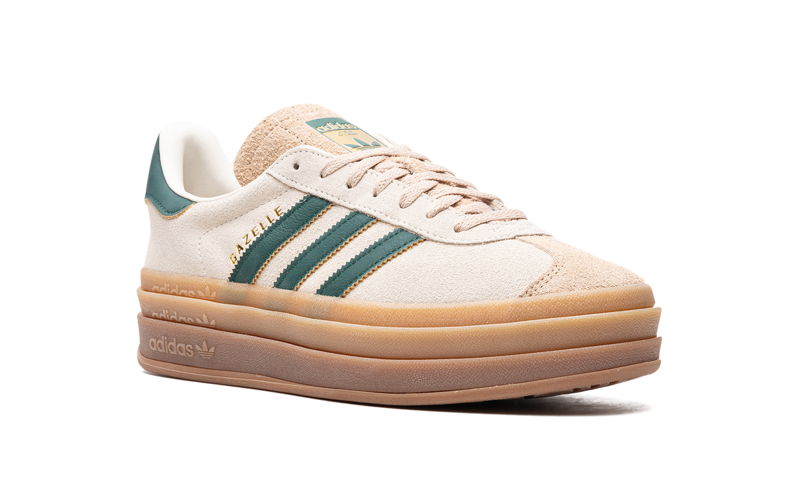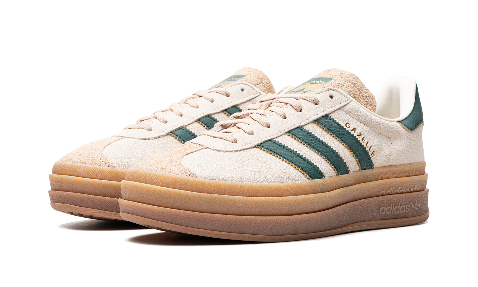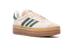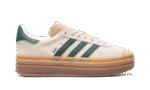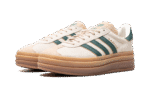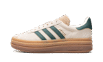 The Women’s adidas Gazelle Bold “Cream White/Collegiate Green” is a women’s-exclusive colorway of the retro sneaker with a stacked midsole and other modifications. The adidas Gazelle Bold updates the original Gazelle silhouette with a triple-stacked gum rubber midsole, giving the sneaker a decidedly contemporary look. The upper is complete with a cream suede construction with a tonal suede overlay on the toe. Collegiate Green leather Three Stripes and gold “Gazelle” branding appear on the side. More green leather accenting can be found on the heel tab while classic “adidas Gazelle” detailing is located on the hairy suede tongue.