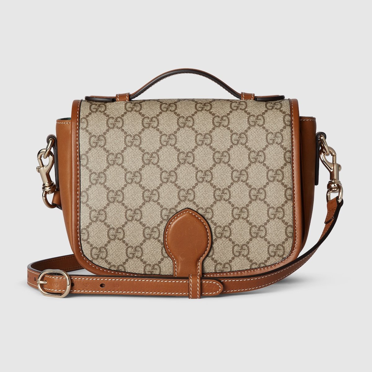 The new GG Emblem collection reinterprets the House??s history of elegance and craftsmanship. This mini top flap shoulder bag features light gold-toned snap hook closure, and reveals an internal construction with Web cotton lining.