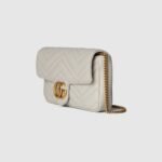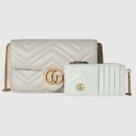 This GG Marmont mini bag is crafted from a light grey matelass?? chevron leather. The signature Double G hardware in antique gold-toned defines the accessory, while a detachable leather card case completes the style.