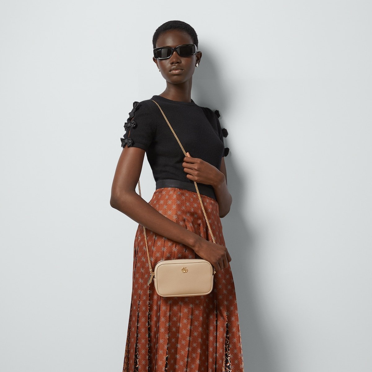 The GG Marmont collection is defined by the emblematic Double G gold-toned hardware, a contemporary take on a Gucci archival motif. This beige leather super mini bag with a chain strap and zip closure reveals two card slots inside for effortless organization.