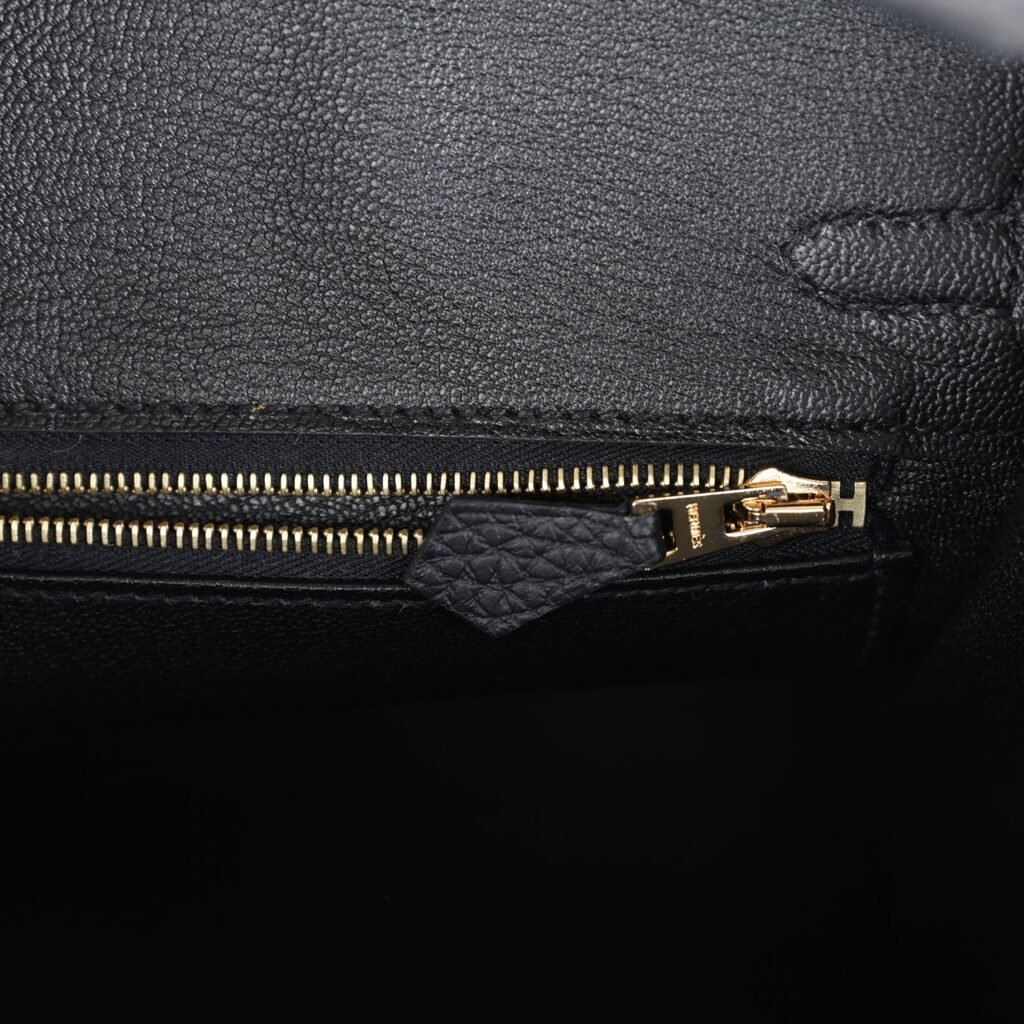The interior is lined with Black chevre and has one zip pocket with an Hermès engraved zipper pull and an open pocket on the opposite side.