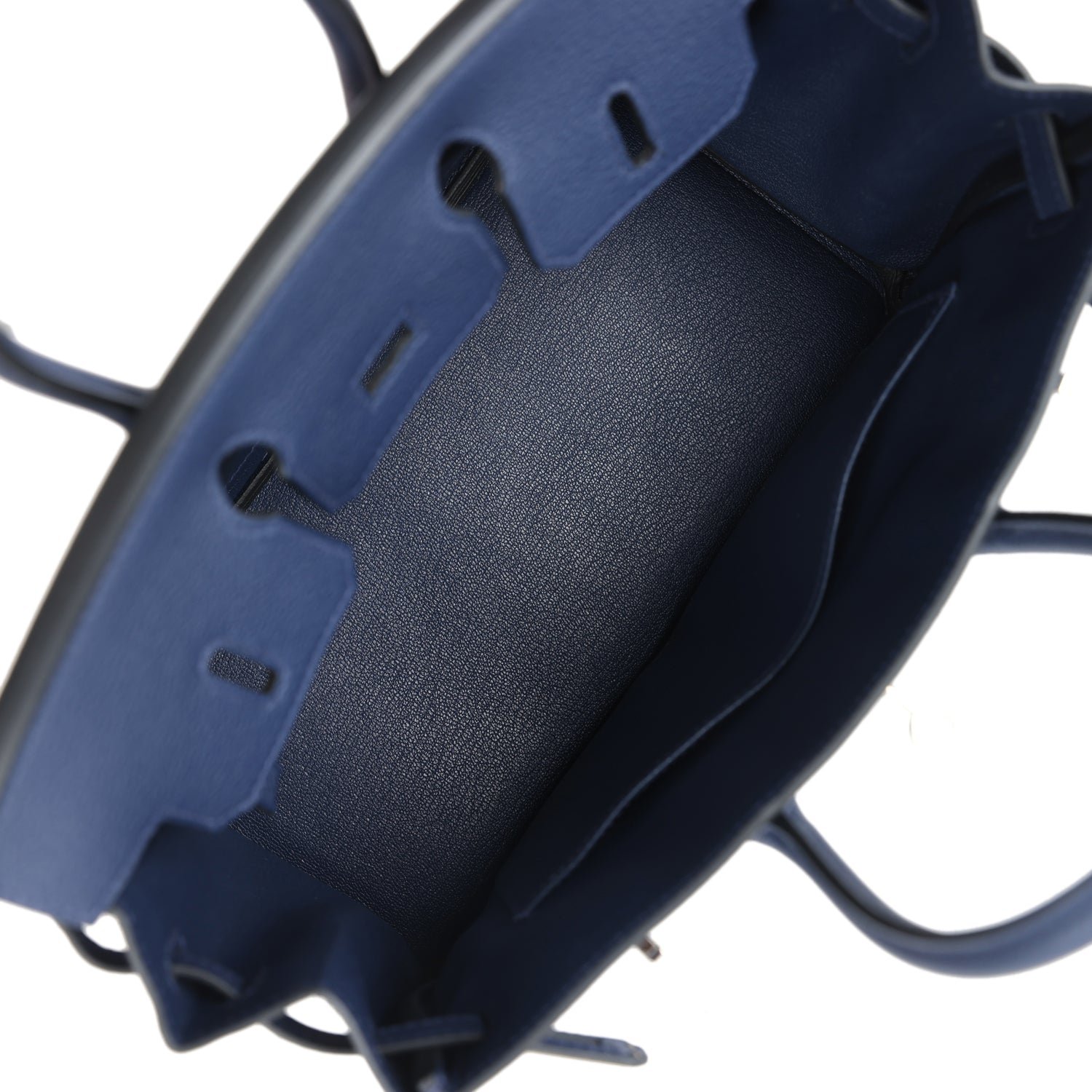 The interior is lined with Bleu Saphir chevre and has one zip pocket with an Hermès engraved zipper pull and an open pocket on the opposite side.