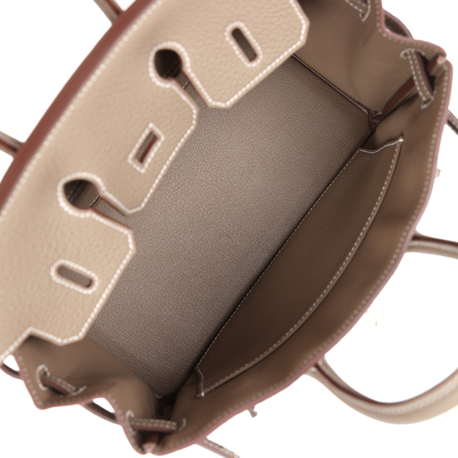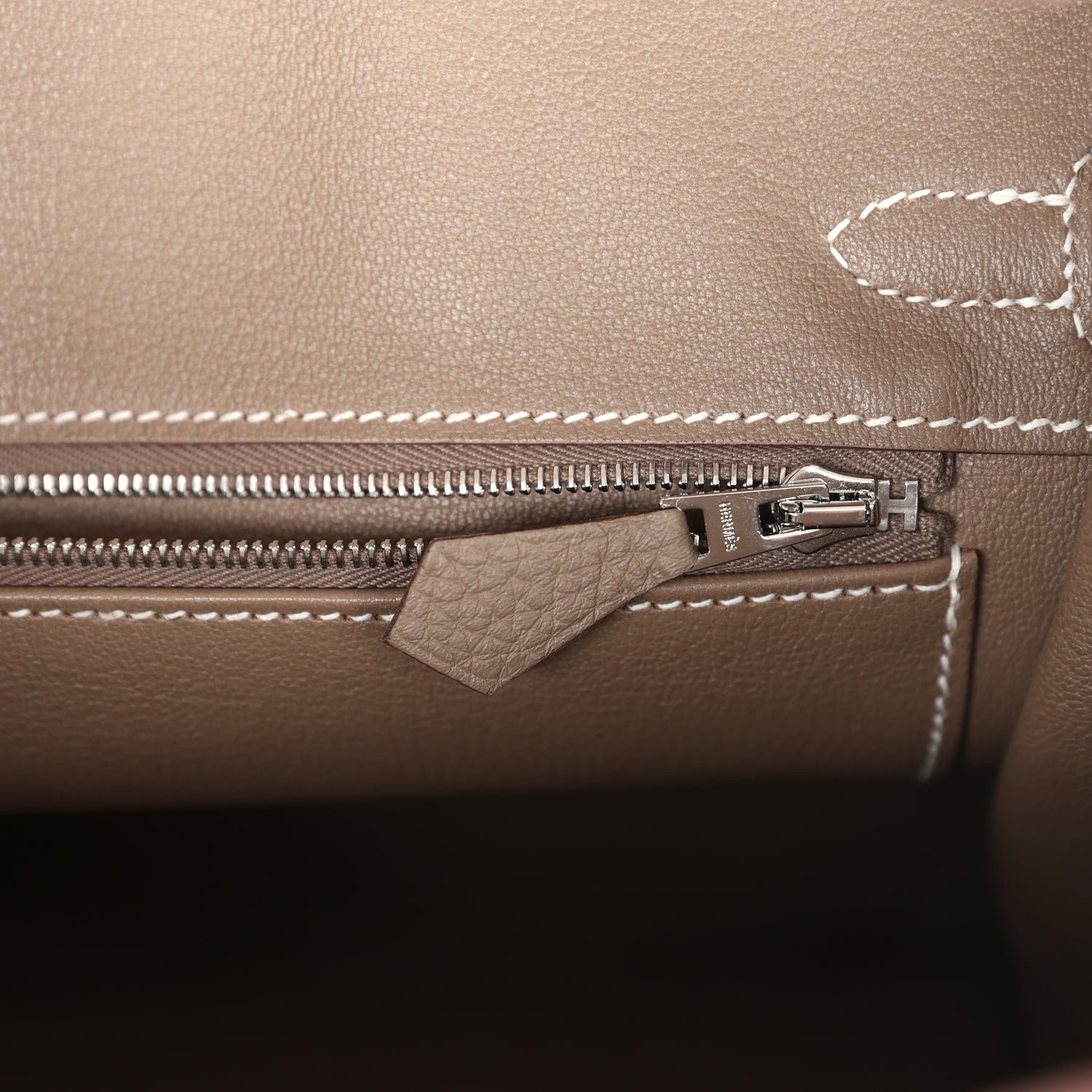 The interior is lined with Etoupe chevre and has one zip pocket with an Hermès engraved zipper pull and an open pocket on the opposite side.