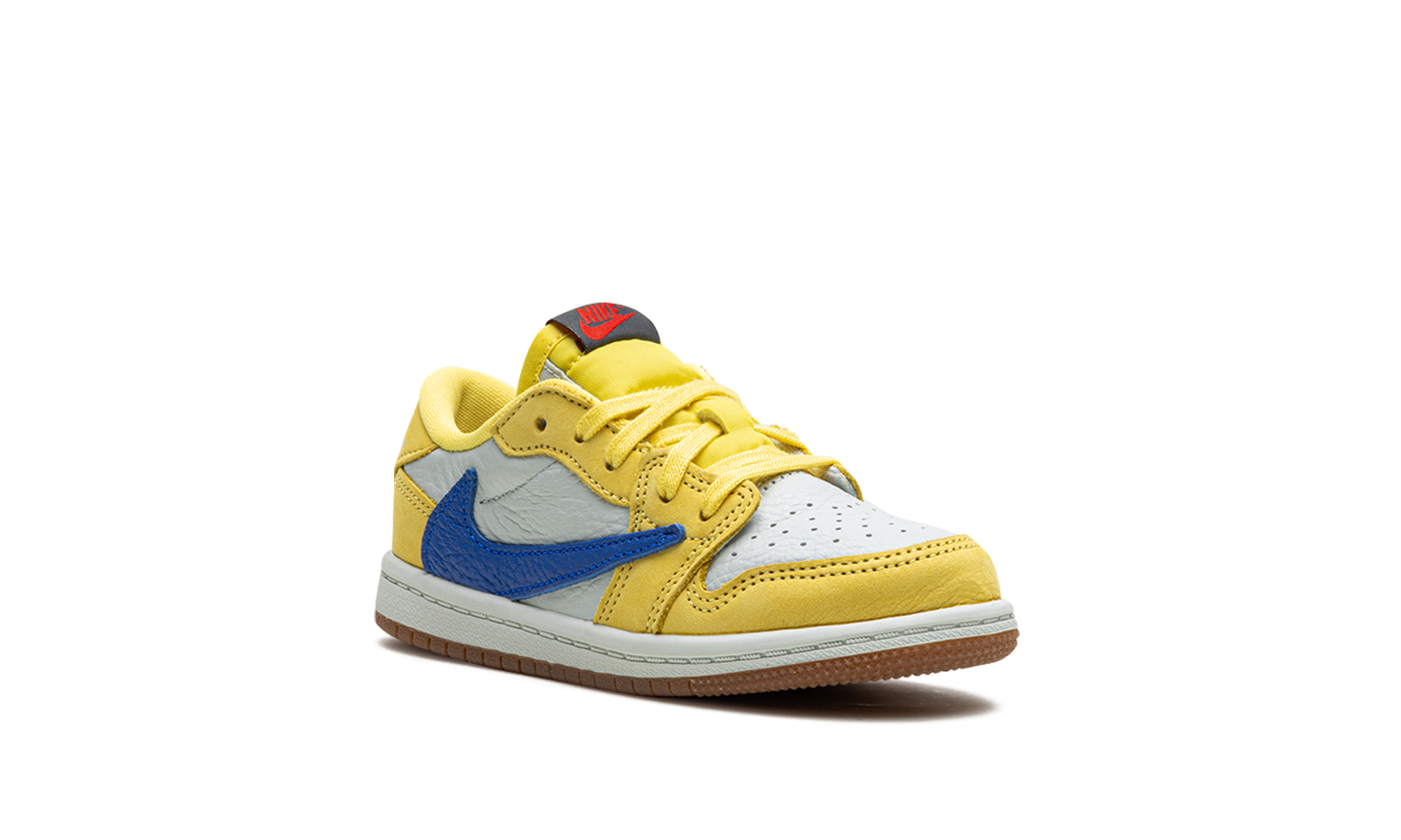 The Travis Scott x Air Jordan 1 Low OG TD “Canary” is the toddler sizing version of the retro basketball shoe inspired by the hip-hop star’s high school. Also known as the “Elkins” after Scott’s high school, the “Canary” Jordan 1 Low OG features bold, creative details such as the rapper’s signature reverse Swoosh and “Cactus Jack” branding. Specifically, the upper has a white leather base with Canary leather overlays on the forefoot and heel. A reverse Racer Blue leather Swoosh can be found on the lateral side and a standard blue leather Swoosh appears on the medial side. Scott’s “smiley face” logo is embroidered on the left heel tab and a “Wings” logo is embroidered on the right heel tab. Classic red “Nike Air” branding appears on the black tongue tag. A gum rubber outsole completes the look. Release date: May 25, 2024