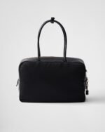 This structured top-handle bag, crafted from Re-Nylon and leather, presents a timeless silhouette with sophisticated charm. The metal hardware and the enameled metal triangle logo adorn the style, while the zipper and padlock closure add a unique accent.
