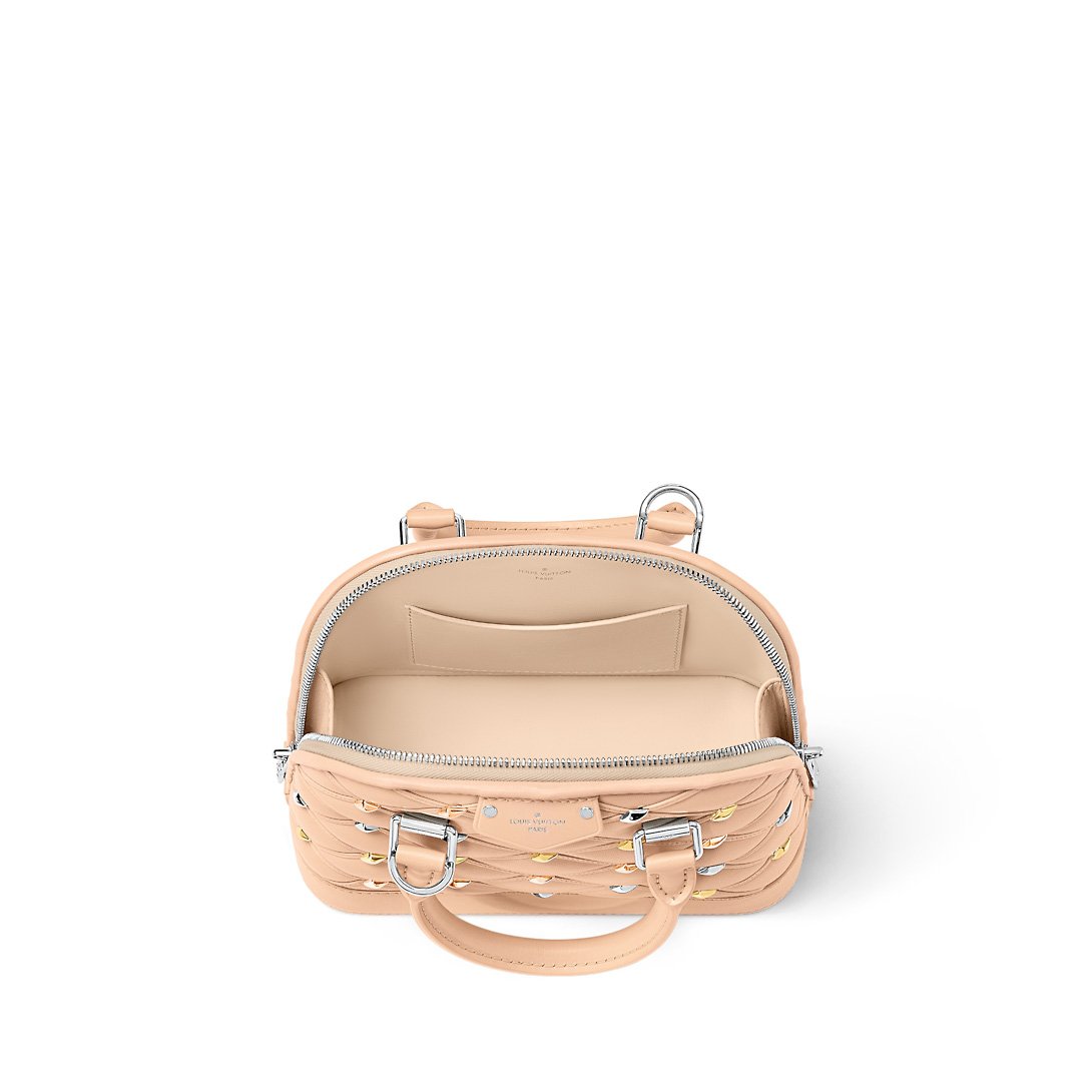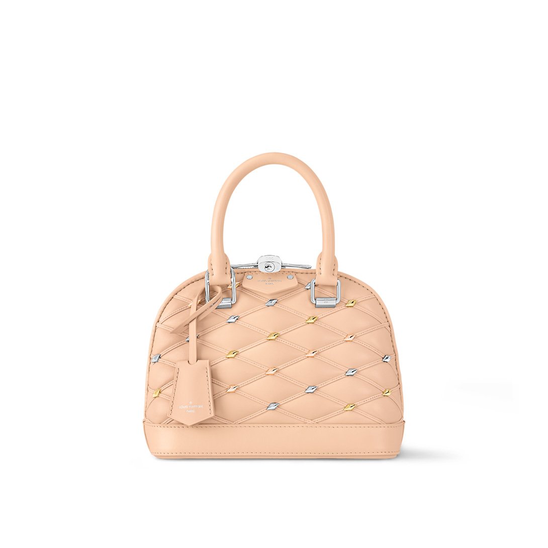 Evocative of Louis Vuitton trunk interiors, with their distinctive quilted lining, the Alma BB handbag is made from lambskin with a diamond motif, emphasized by silver- and gold-color diamond-shaped studs. In addition to the two top handles in rolled leather, the Alma features a removable and adjustable shoulder strap for a variety of comfortable carries.