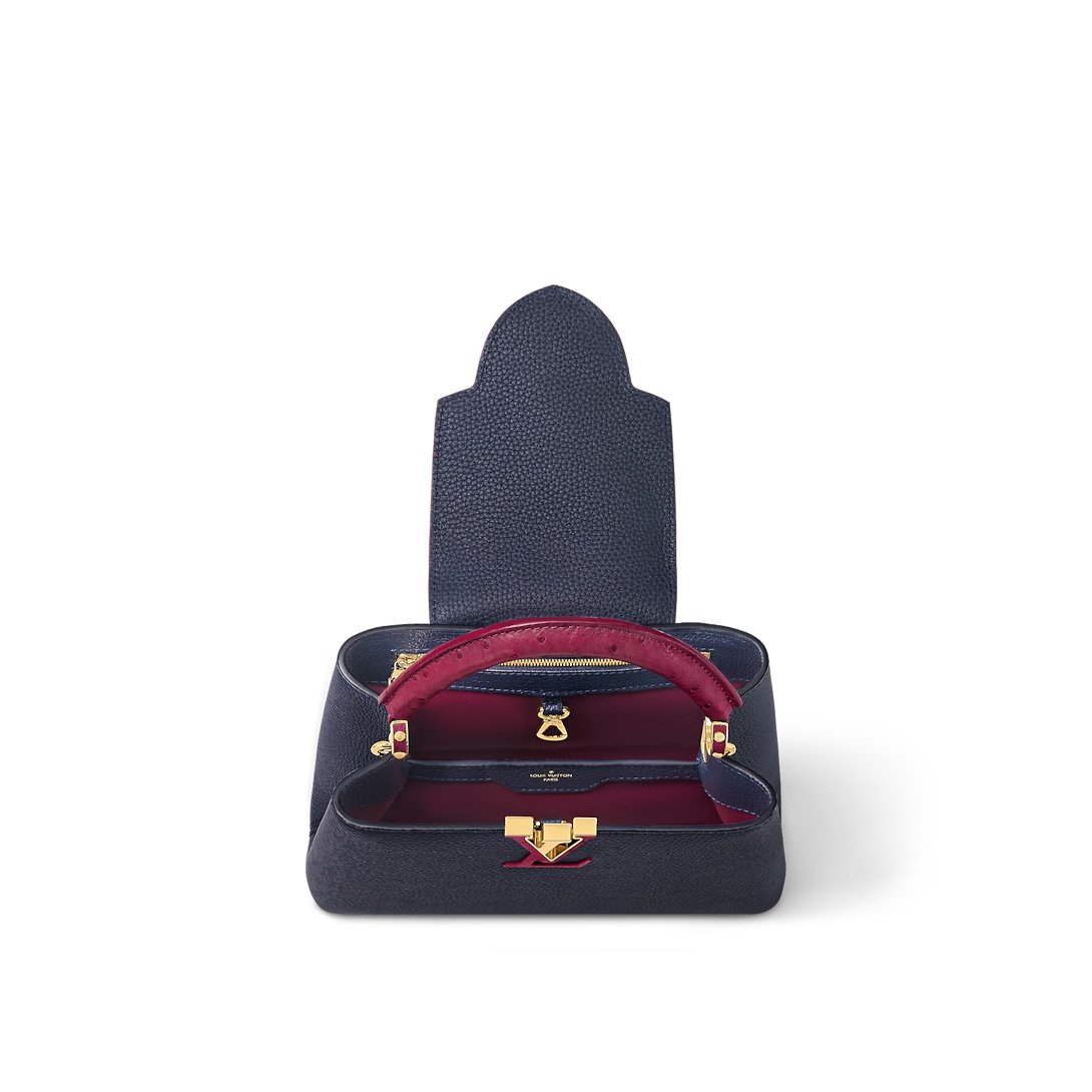 This eye-catching Capucines BB handbag is made from deep blue Taurillon leather with bright-red ostrich leather on the flap and top handle. It can be carried with the flap tucked into the bag to feature the LV signature or outside to display a more discreet Monogram Blossom. A wide removable strap enables shoulder and cross-body carry.