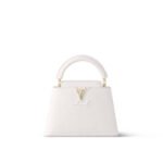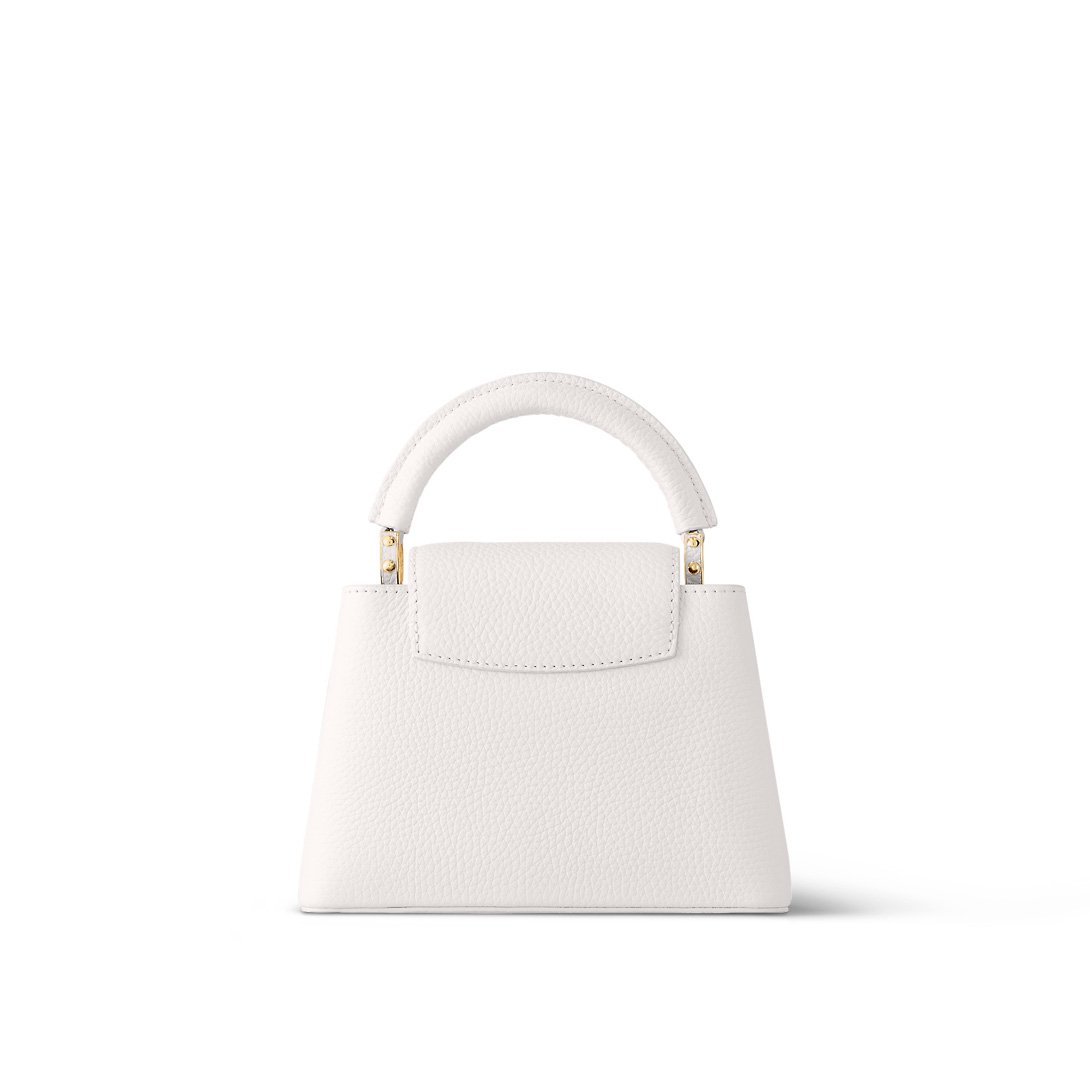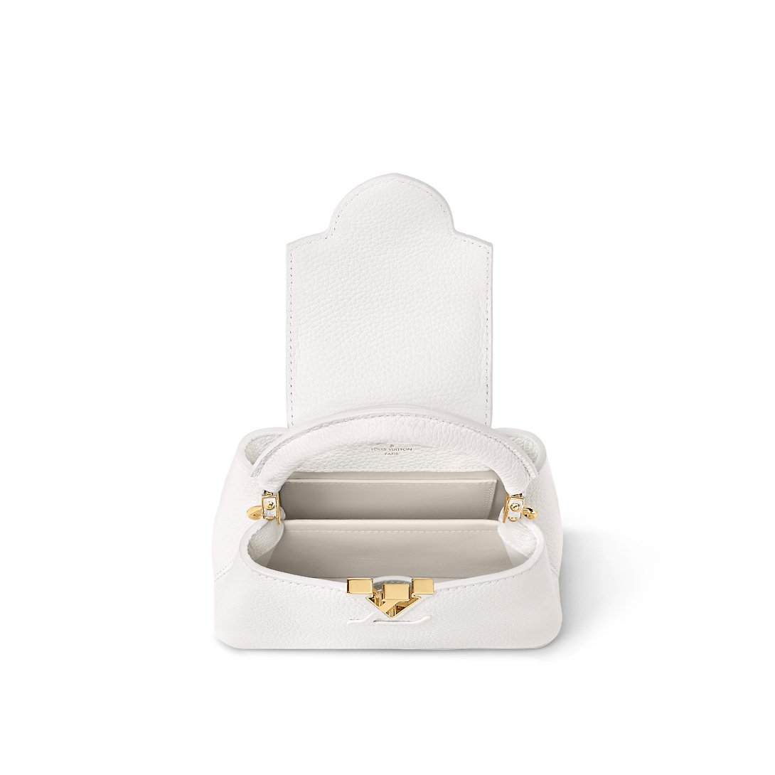 The refined Capucines Mini handbag looks stunningly chic in rich white Taurillon leather finished with golden handle rings and the emblematic LV Initials. This smaller version of the classic Capucines is a pleasure to carry over the shoulder or cross-body thanks to its wide removable strap.