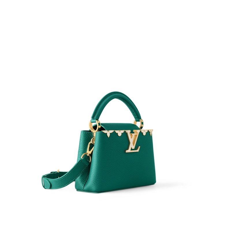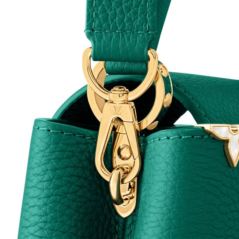 Part of the new permanent Flower Crown line, this sophisticated Capucines Mini design is adorned with a crown of mother-of-pearl effect Monogram flowers, finished with elegant gold-toned hardware. The refined design opens to reveal a compartmented interior fitted with multiple pockets, and features a removable strap, offering numerous carry options.