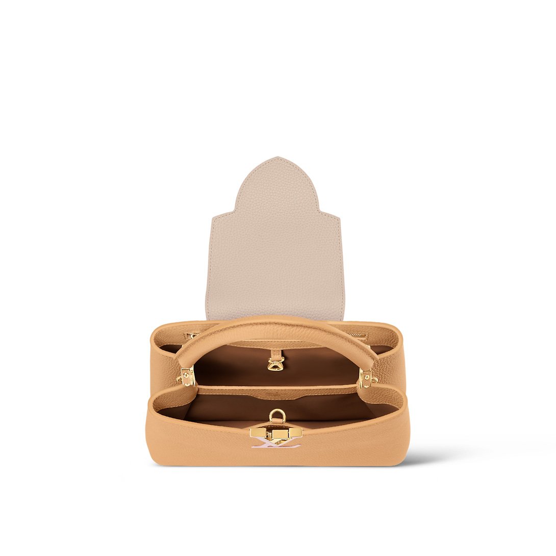 An elegant new color block combination comes to the Capucines MM handbag this season:classic light brown combined with touches of soft beige and pink. The colorway brings a warm feminine feel to this emblematic handbag, with its iconic LV signature. A wide removable strap, in addition to the top handle, multiplies carry options.