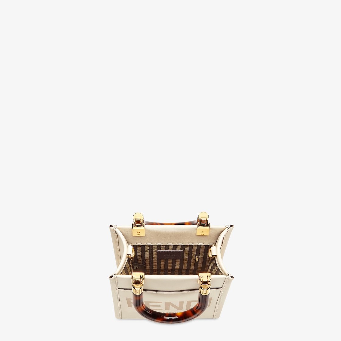 Mini Sunshine Shopper bag made of white leather with hot-stamped “FENDI ROMA” and stiff tortoiseshell-effect plexiglass handles.