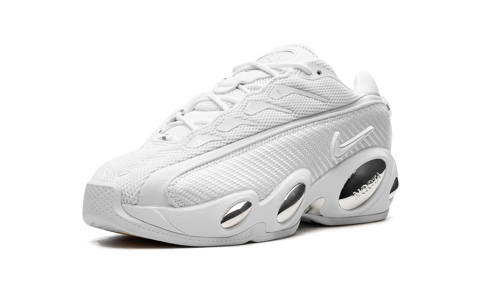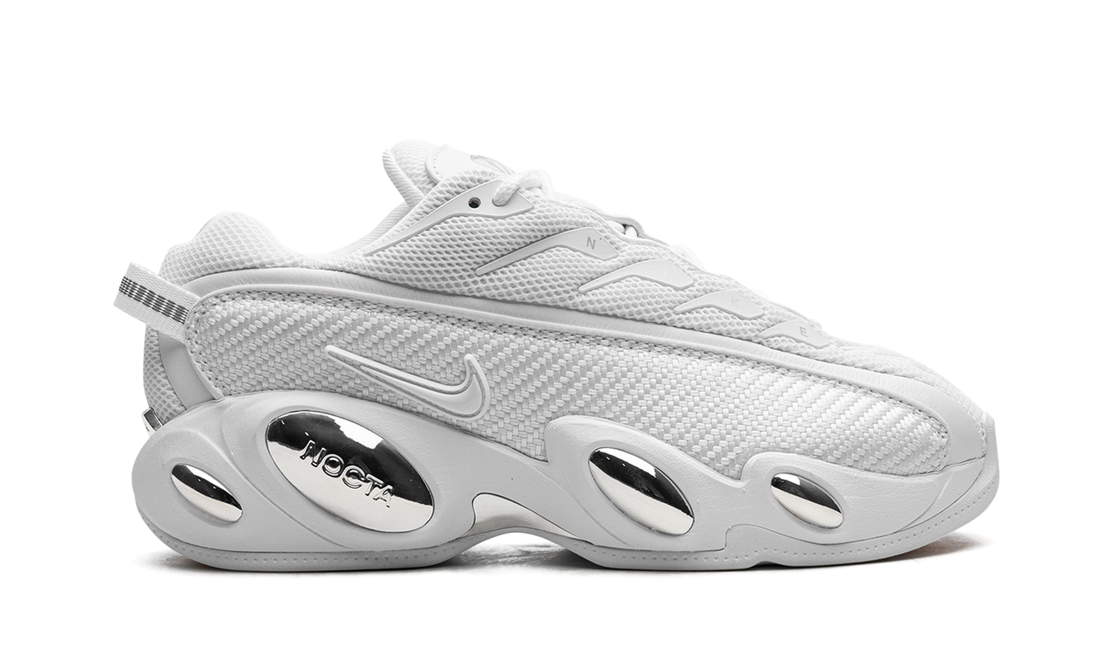 The Nike NOCTA Glide “White/Chrome” is a mostly all-white colorway of Drake’s second signature shoe with Nike that nods to one of the brand’s popular retro basketball models. The shoe in question that inspires the Nike NOCTA Glide is the Nike Zoom Flight 95, the revered basketball shoe that was worn primarily by Jason Kidd in the NBA in 1995-96. Drake’s Nocta Glide features a white mesh upper with a carbon fiber-inspired mudguard, also designed in white on the “White Chrome” colorway. “NIKE” branding appears on the eyelets and a white Swoosh is found on the side. The Nocta Glide has four pods on the midsole instead of the three seen on the Zoom Flight 95. The features appear in chrome to complete the shoe’s design. Release date: October 27, 2023