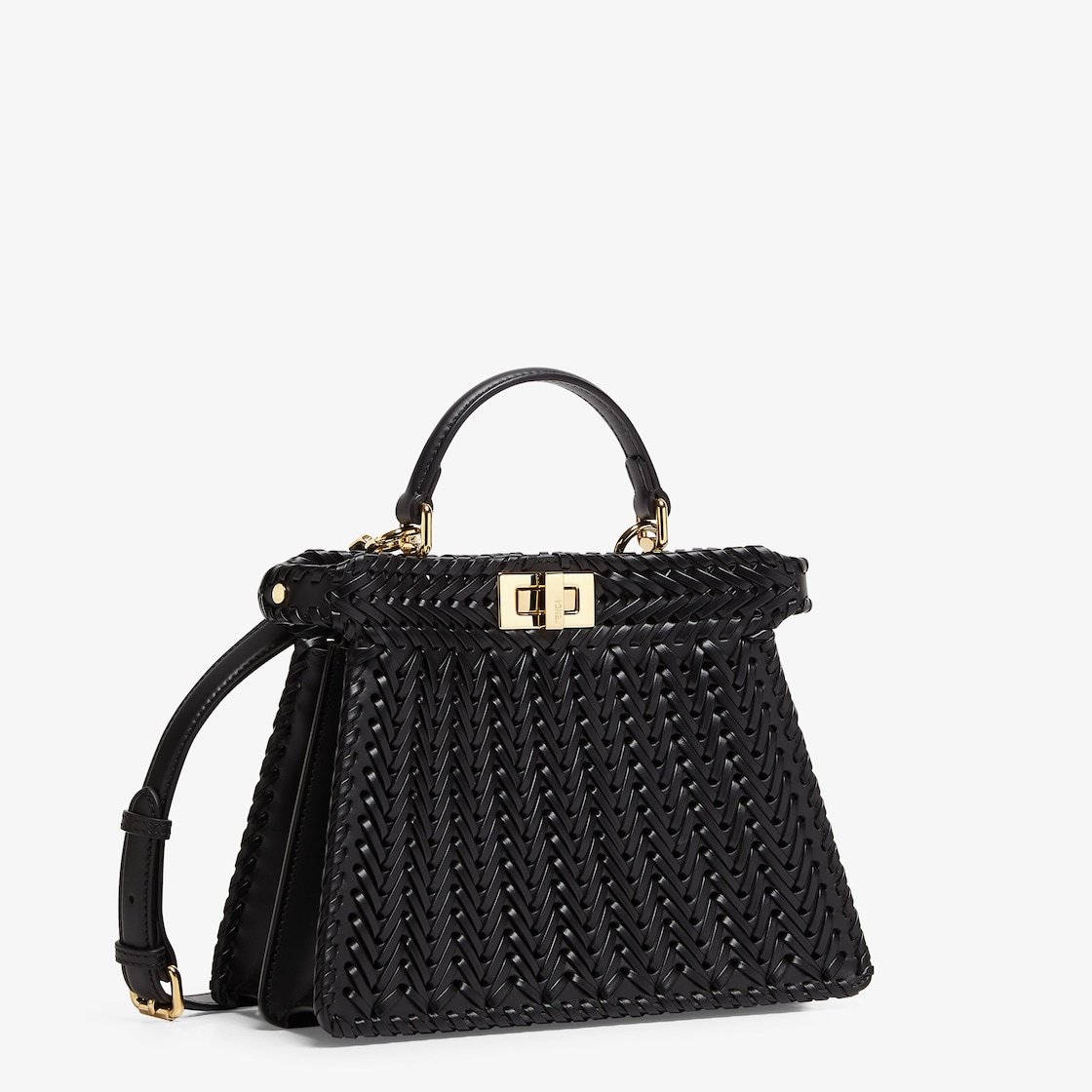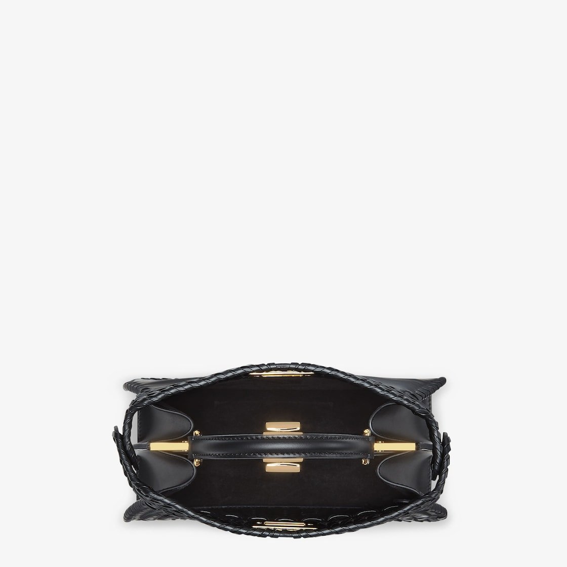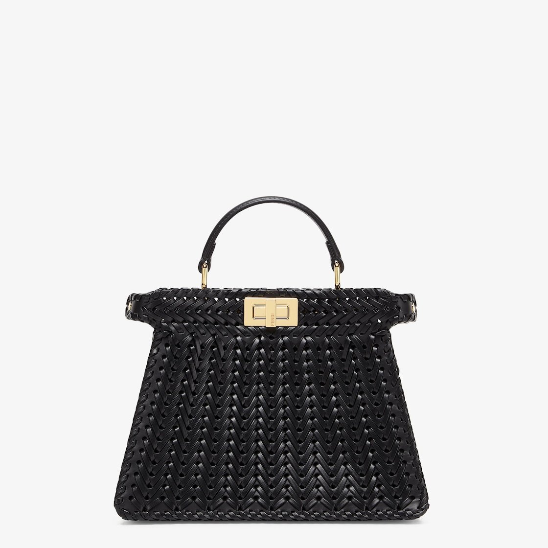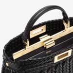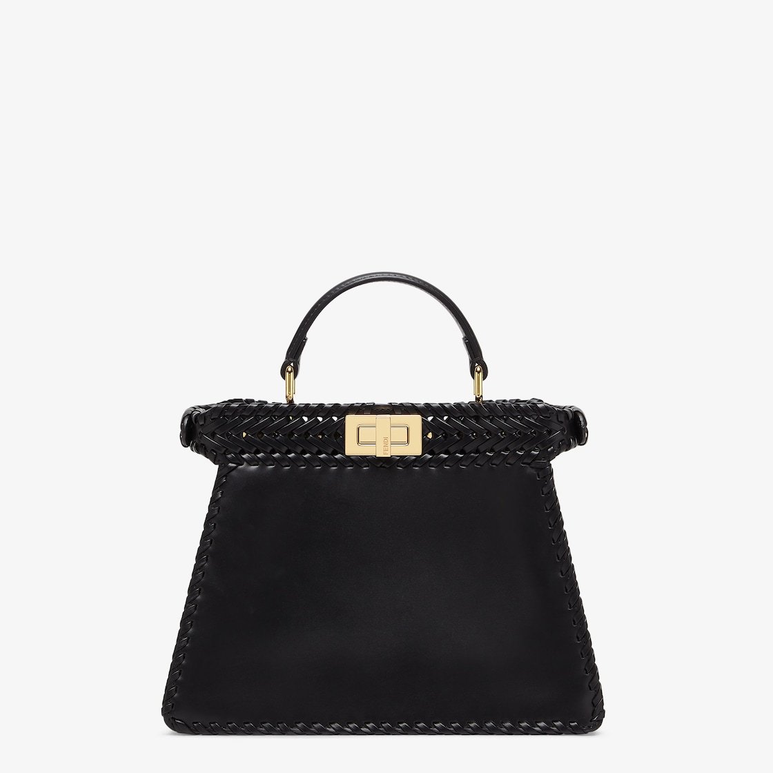 Iconic small Peekaboo ISeeU bag made of black leather with borders and front panel embellished with a tone-on-tone interlace. Decorated with the iconic twist lock on both sides.