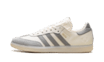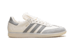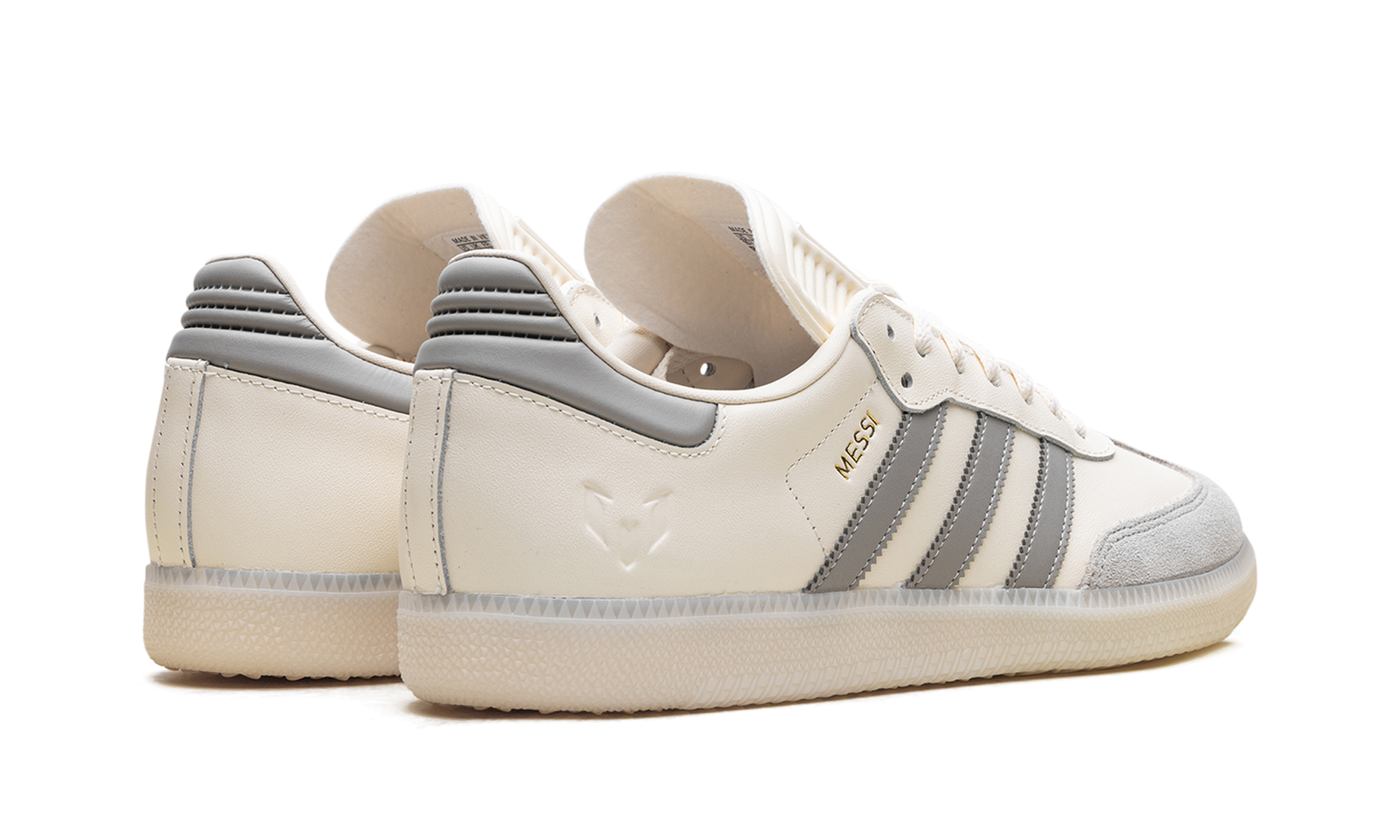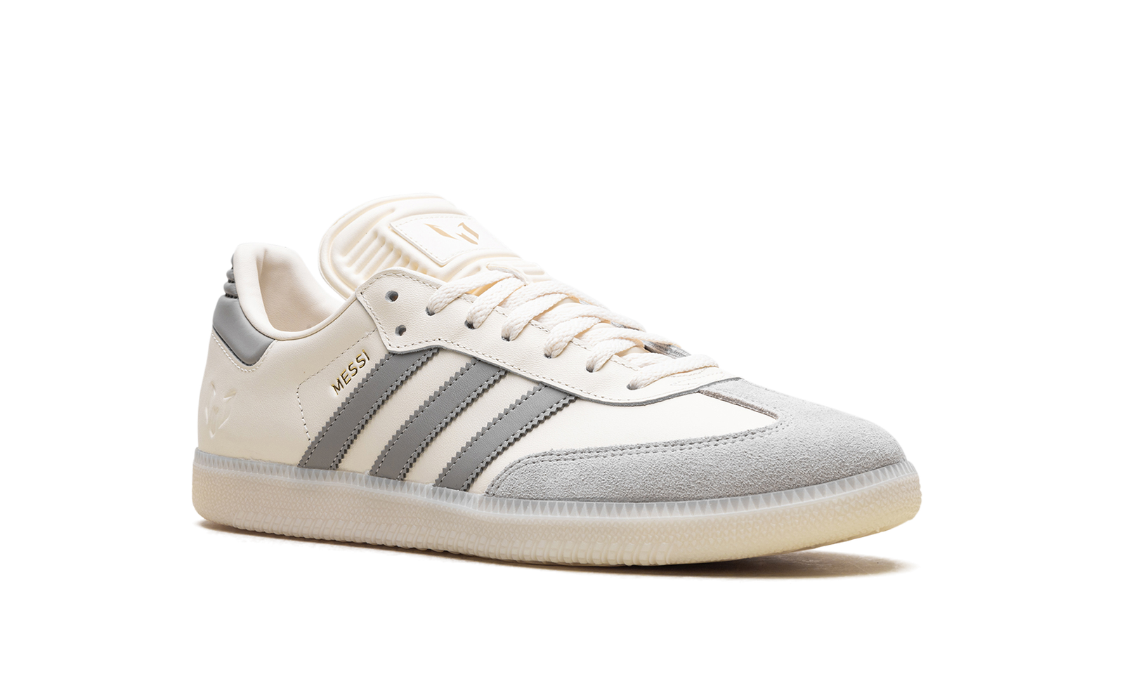 Step into soccer legend status with the Adidas Samba “Lionel Messi,” the “GOAT’s Classic,” in a creamy “Cream White” colorway. This special-edition sneaker pays tribute to the icon with a luxurious leather upper and the signature suede T-toe. Gold foil “MESSI” lettering on the side and his personal logo on the tongue add a premium touch. Retaining the classic gum rubber outsole, this versatile shoe is a must-have piece of footwear history that celebrates the greatness of Leo Messi.