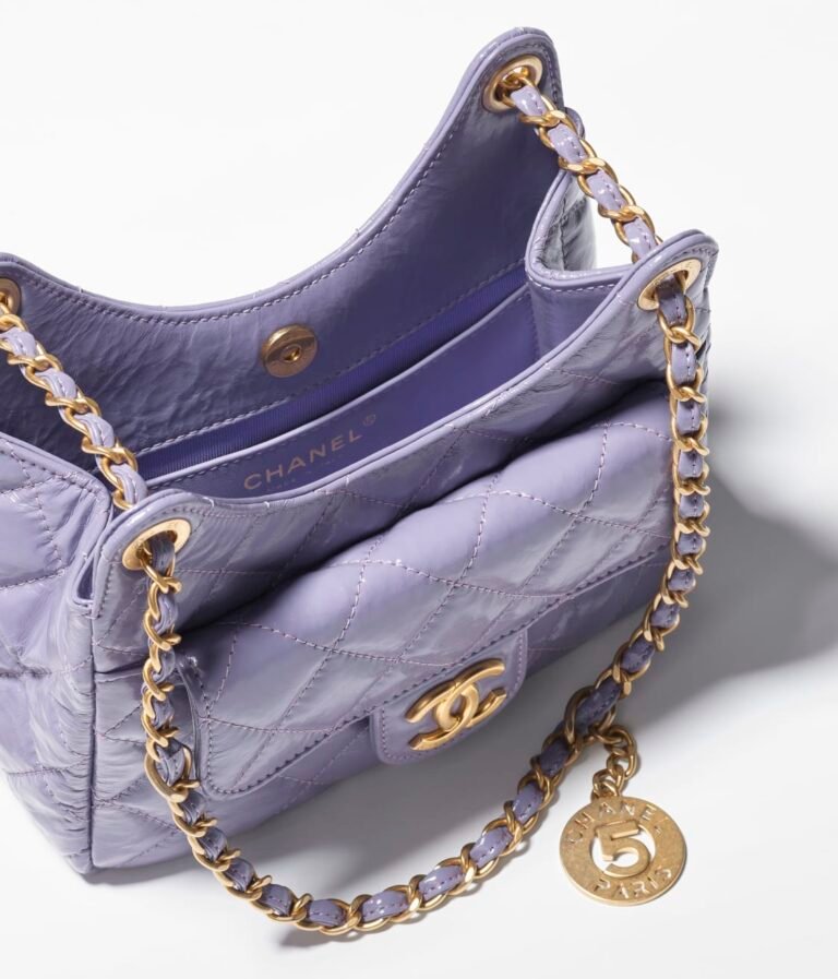 Measurements:6.6 x 7.4 x 2.3 in / 17 x 19 x 6 cmThis Chanel Purple Quilted Shiny Crinkled Calfskin Small