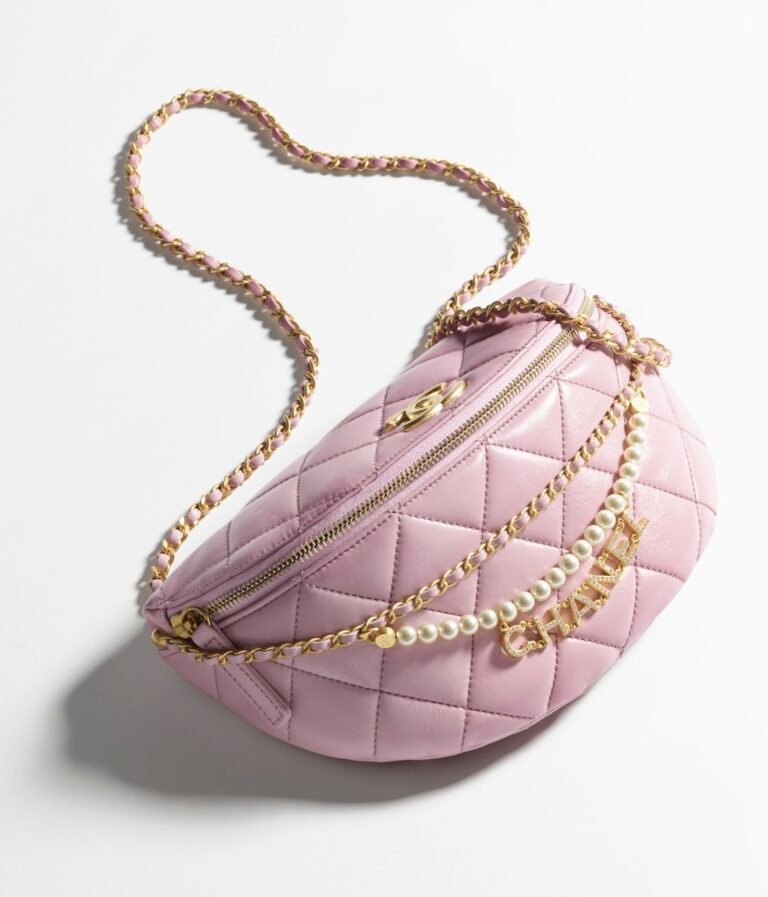 Measurements:6.6 x 9.4 x 4.3 in / 17 x 24 x 11 cmThis small waist bag features pink lambskin, faux