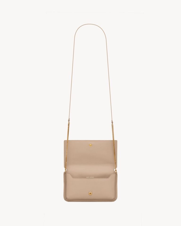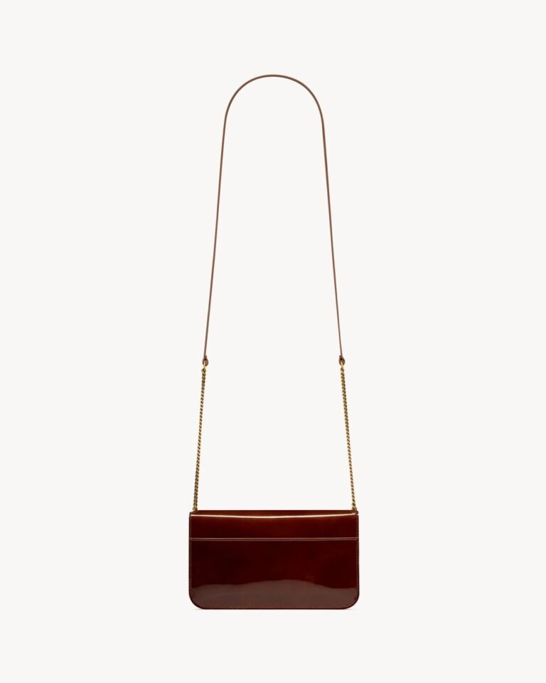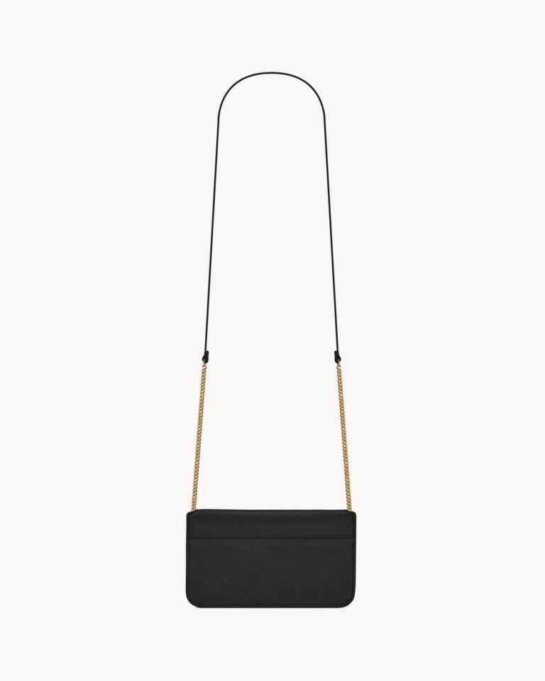 Cell phone holder with front flap decorated WITH THE CASSANDRE, featuring a leather and chain shoulder strap. Dimensions:18 x 11