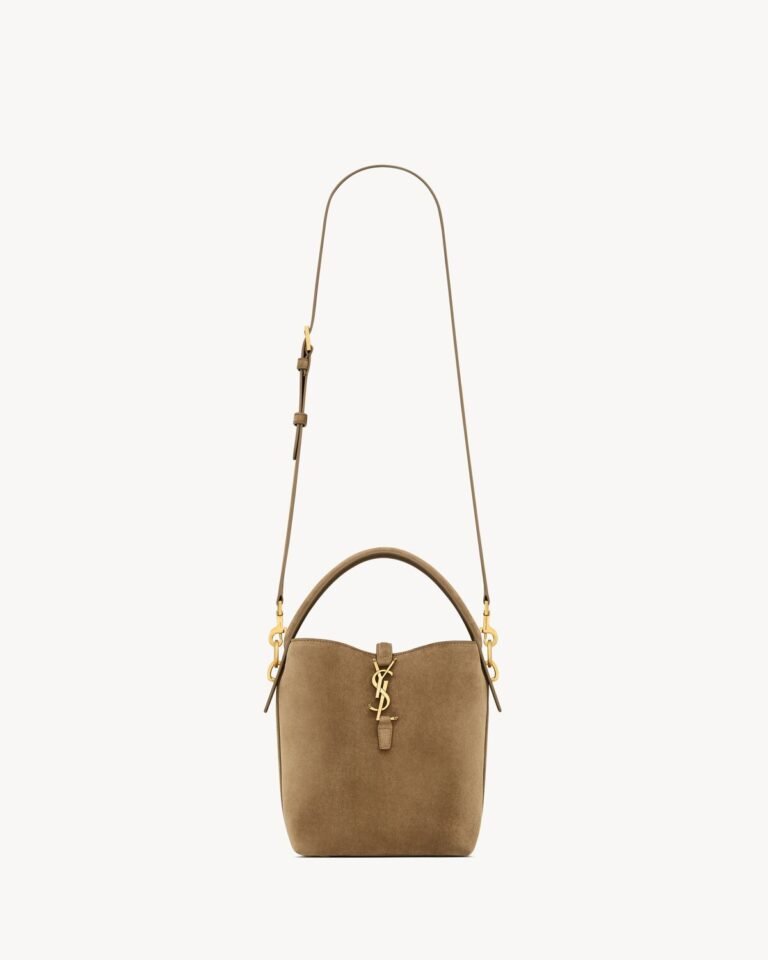 BUCKET BAG FEATURING THE CASSANDRE HOOK CLOSURE, TOP HANDLE AND AN ADJUSTABLE AND DETACHABLE SHOULDER STRAP. suede liningbronze-toned hardwareCASSANDRE hook