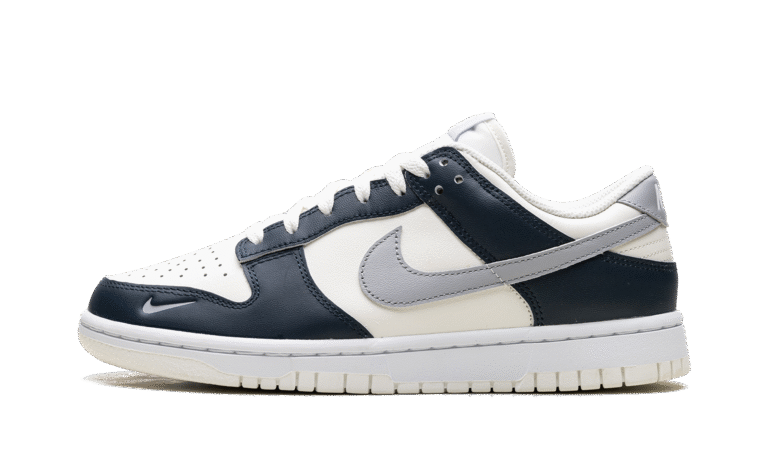 The Nike Women’s Dunk Low ‘Sail Armory Navy’ features a grey Swoosh on an off-white leather upper. Contrasting navy leather