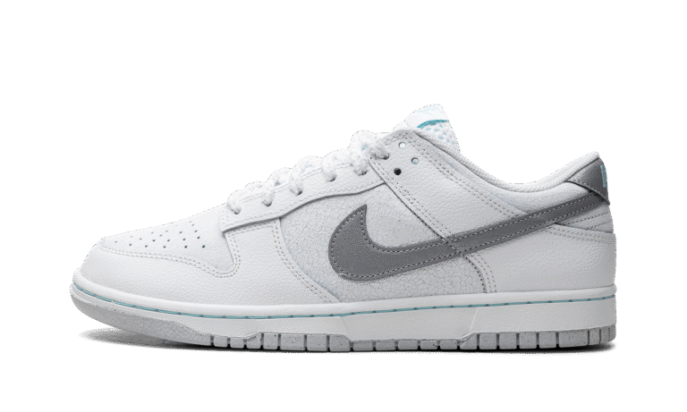 The Winter Storm Nike Dunk Low SE comes with a cracked leather upper in icy blue hues, with tumbled white