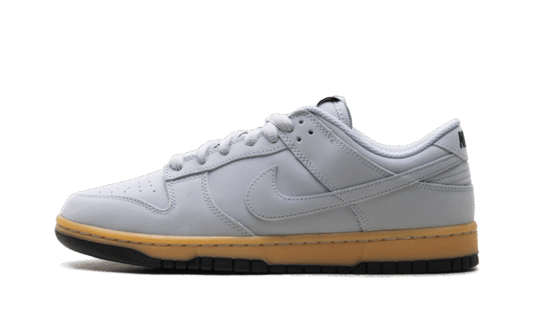 The Nike Dunk Low SE ‘Wolf Grey Gum’ showcases a neutral grey finish on the leather upper, featuring a perforated