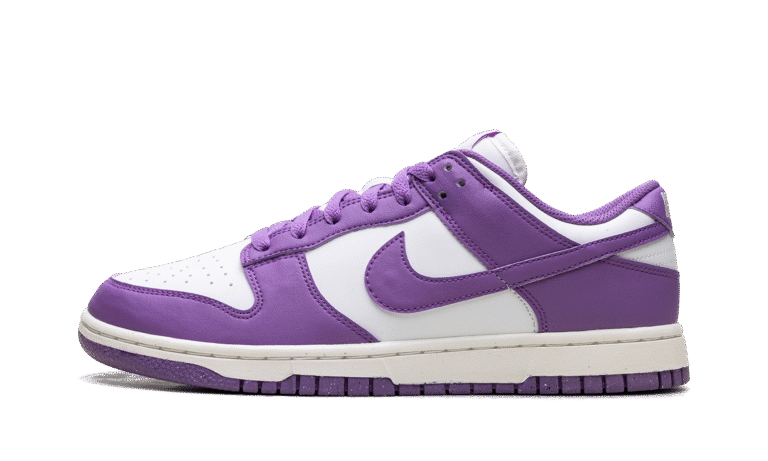 The women’s Black Rasperry Nike Dunk Low Next Nature has a smooth Summit White leather upper as its base. This