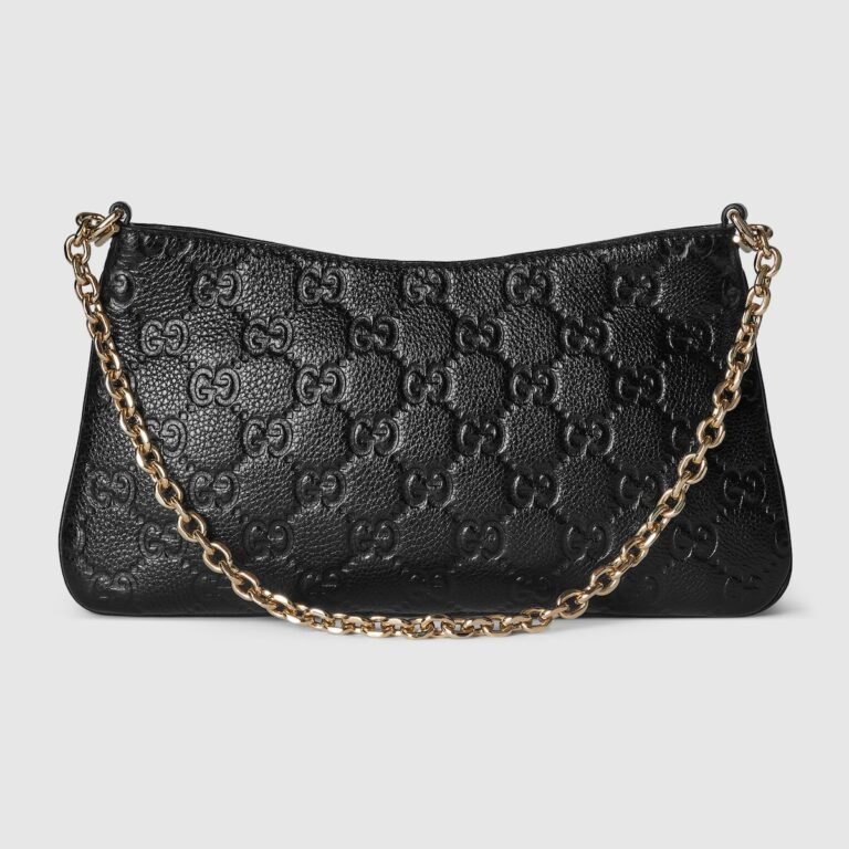 The new GG Emblem collection reinterprets the House??s history of elegance and craftsmanship. This medium shoulder bag is crafted from